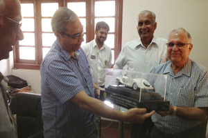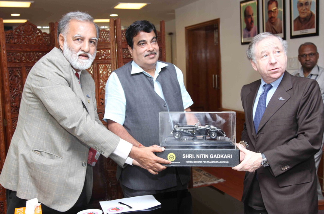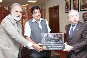 Mr. Nitin Dossa (Executive Chairman, WIAA) & Mr. Jean Todt (President, FIA, the World body for Sports & Mobility) giving a Momento to Nitin Gadkari, Hon'ble Transport Minister, Govt. of India